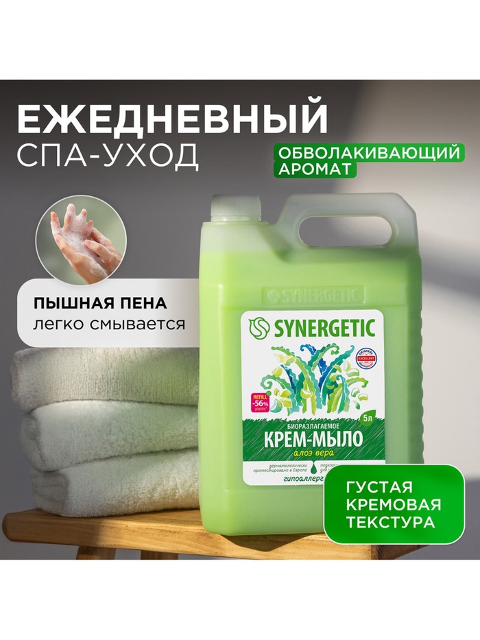 Крем-мыло жидкое SYNERGETIC, биоразлагаемое, для мытья рук и тела «Алоэ вера», 5 л