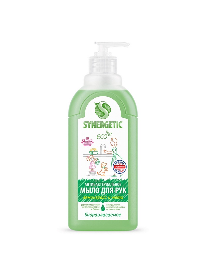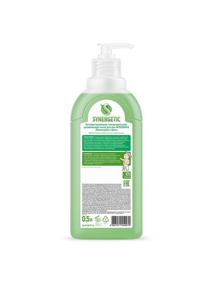 Антибактериальное увлажняющее жидкое мыло SYNERGETIC "Лемонграсс и мята" эффективно очищает кожу от любых загрязнений даже в холодной воде. Особенно эффективно против неприятных запахов. Комбинация растительных К-тензидов, морской соли и натуральных эфирных масел лемонграсса, мяты, чайного дерева, эвкалипта и тимьяна обеспечивает длительный антибактериальный эффект с защитой от микроорганизмов на 99,9%. Растительный глицерин обеспечивает интенсивное увлажнение кожи. Комплекс витаминов A, E, F повышает сопротивляемость кожи неблагоприятному воздействию внешней среды. Мультифункциональный компонент натурального происхождения софоролипид мягко очищает и сохраняет естественный микробиом кожи. Гипоаллергенное средство подходит для чувствительной кожи. Мыло дерматологически протестировано независимым исследовательским институтом Dermatest®️ в Германии. Биоразлагаемые компоненты безопасны для природы и человека и не вредят микрофлоре септических установок. Нанести небольшое количество на влажную кожу, вспенить, смыть водой. Dicalcium Phosphate Dihydrate, Sorbitol, Aqua, Glycerin, Silica, Sodium Lauroyl Sarcosinate, Cellulose Gum, Aroma, Xylitol, Zinc Citrate, Calendula Officinalis Flower Extract, Chamomilla Recutita (Matricaria) Extract, Hydrates Silica Plus Pigment, Hydroxyapatite, Sodium Benzoate, Рotassium Sorbate, Stevioside, O-Cymen-5-ol, Bisabolol, Vitamin Premix (Tocopherol (Vitamin E), Thiamine (Vitamin B1), Riboflavin (Vitamin B2), Niacinamide, Pantothenic Acid, Pyridoxine (Vitamin B6), Cyanocobalamin (Vitamin B12), Ascorbic Acid (Vitamin C), Folic Acid (Vitamin B9), Biotin, Maltodextrin, Retinyl Palmitate (Vitamin A Palmitate), Beta Carotene.
