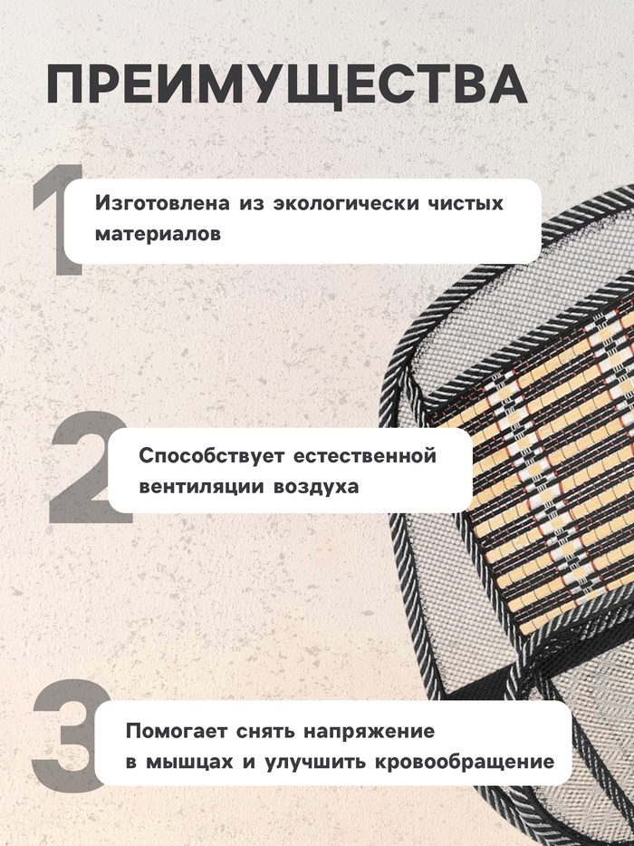 Накидка-массажёр с поясничной опорой TORSO станет полезным приобретением для водителей и людей, ведущих преимущественно сидячий образ жизни и испытывающих из-за этого болевые ощущения и постоянный дискомфорт. Изделие окажет благотворное воздействие на мышцы: разомнёт их и снимет усталость. На рабочем месте, в машине и дома вы всегда стремитесь окружить себя комфортом. Для того чтобы сидячий образ жизни не сказывался негативно на вашем организме, используйте деревянную накидку на кресло. Она снимет нагрузку с позвоночника, улучшит кровообращение, обеспечит вам хорошую вентиляцию тела и удобство. Ортопедическая спинка обеспечивает правильную посадку в кресло и делает процесс вождения более безопасным. Правильная осанка — залог здоровья позвоночника. Аксессуар станет полезным подарком для любого водителя и офисного работника.
