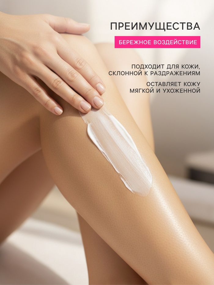 Воздействие депилятора на кожу может вызвать раздражение, особенно на участках с особо чувствительной кожей, крем Velvet, благодаря ультрасовременной формуле и нежной текстуре, позволяет деликатно удалить нежелательные волоски безопаснее, чем раньше. Благодаря успокаивающему действию ромашки, крем ухаживает за кожей уже во время депиляции. Оливковое масло и витамин Е, входящие в состав депилятора, оказывают противовоспалительное действие, смягчают кожу и делают ее нежной и шелковистой. Безболезнен и приятен в использовании.