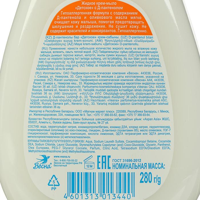 Описание: жидкое крем-мыло с Д-пантенолом Детское идеально для бережного очищения кожи новорожденного. Деликатная крем-формула не сушит кожу малыша и дарит ощущение невероятной мягкости и комфорта. Гипоаллергенная формула крем-мыла Весна Детское с Д-пантенолом и оливкового масла мягко очищает кожу малыша, помогая предотвращать шелушение и раздражение. Крем-мыло отлично пенится и смывается.