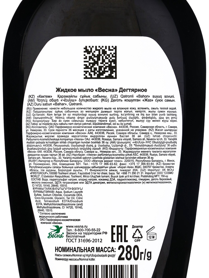 Описание: мыло жидкое Весна Главаптека Дегтярное глубоко очищает, подсушивает, обладает ранозаживляющим действием, помогает избавится от угрей, черных точек, воспалений. Деготь способствует быстрой регенерации кожи, а дегтярным мылом можно не только умываться, но и делать из пены мыла делать маску на несколько минут это естественный пилинг, который, к тому же, выравнивает цвет кожи. Жидкое мыло густое, но текучее и лёгкое, не вязкое, ощущения смолистости на руке не даёт. Жидкое мыло не содержит искусственных красителей и парфюмерных добавок. Дегтярным мылом можно мыть волосы и кожу головы помогает от перхоти.