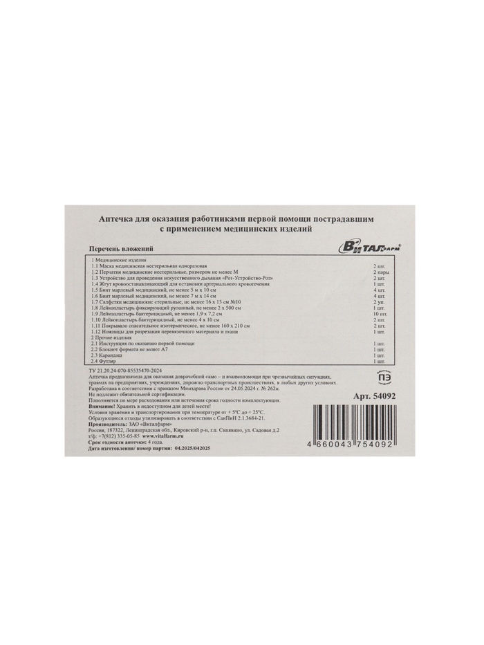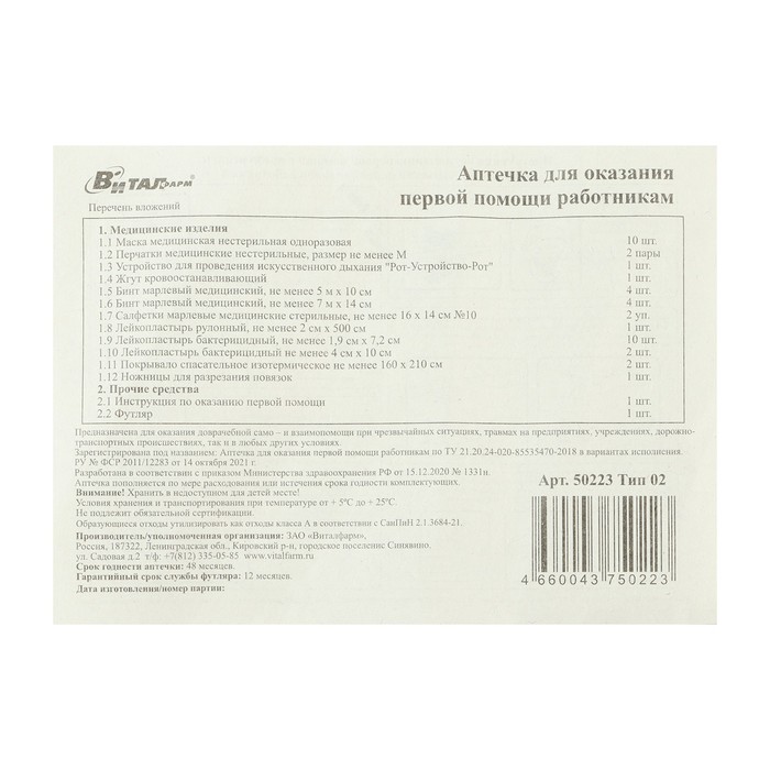 Аптечка для оказания первой помощи работникам Виталфарм, по приказу № 262н, пластик