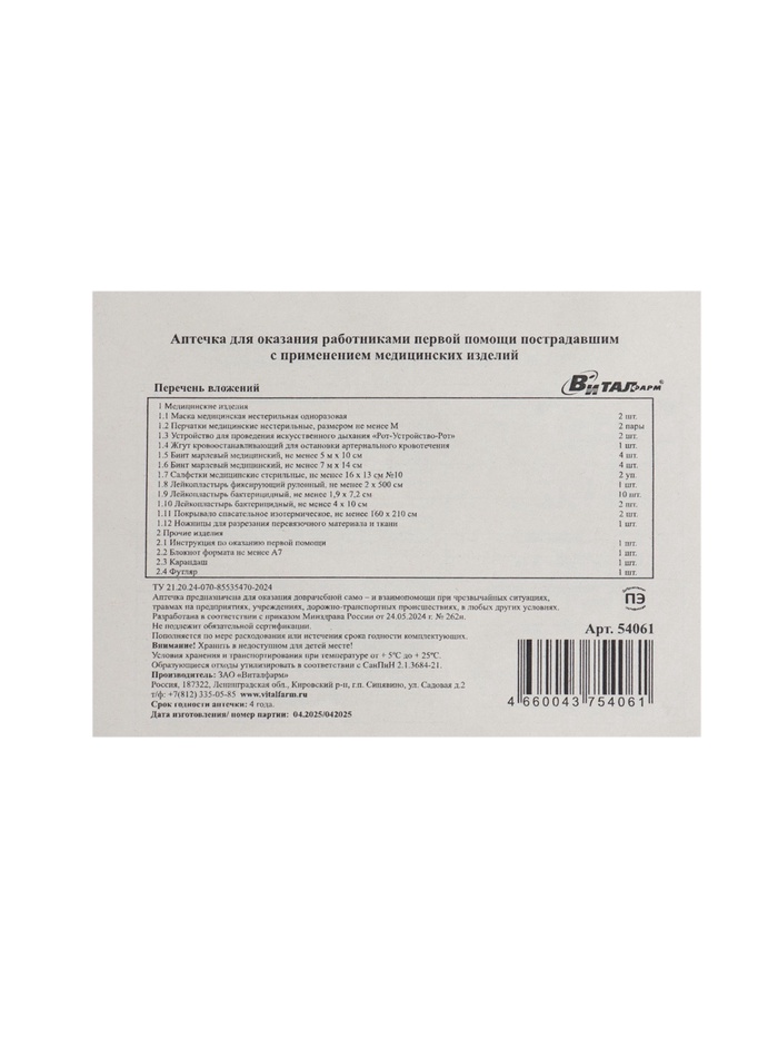 Аптечка для оказания первой помощи работникам Виталфарм, по приказу № 262н, пластик
