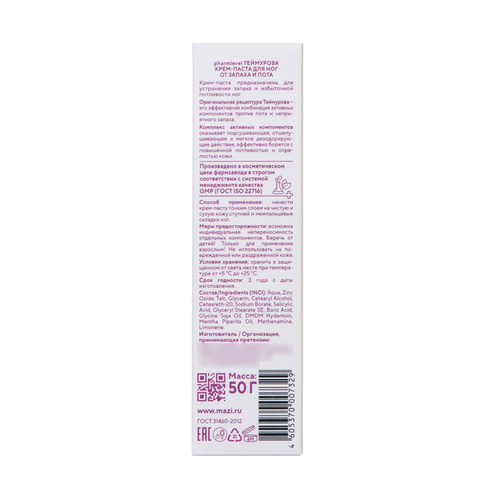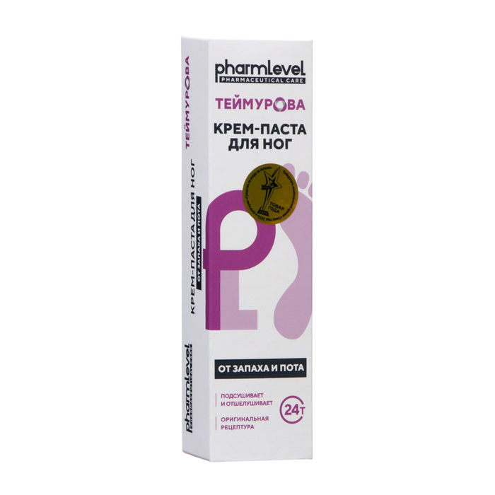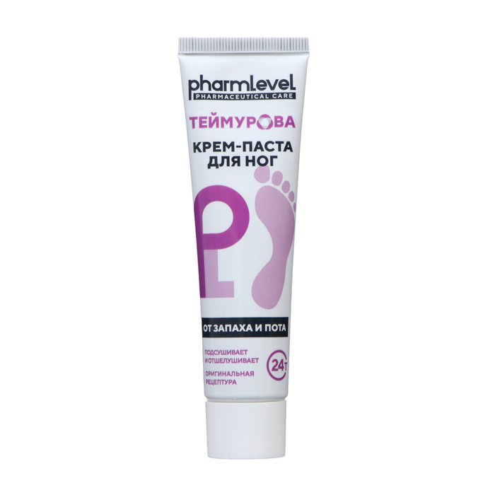Крем-паста ТЕЙМУРОВА для ног от запаха и пота предназначена для устранения запаха и избыточной потливости ног. Комплекс активных компонентов крем-пасты оказывает подсушивающее, отшелушивающее и мягкое дезодорирующее действие, эффективно борется с повышенной потливостью и опрелостью кожи ног.