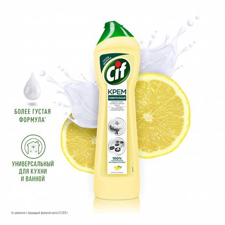Устали от известкового налета? Не можете удалить пятна в ванной или на кухне? Не нравятся царапины после уборки? Густой чистящий крем Cif 100% удалит грязь на кухне и в ванной, оставляя поверхности 100% сияющими и гладкими. Крем удаляет грязь благодаря силе микрокристаллов, которые помогают добиться чистых, сияющих и гладких поверхностей. Легко нанести, легко протереть, легко смыть. Крем проникает и полностью удаляет такие въевшиеся и застарелые загрязнения, как засохший жир, пригоревшая еда, мыльные разводы и известковый налет. Притом, он не царапает поверхность и обладает приятным свежим лимонным запахом. Улучшенная текстура позволяет легче смывать средство, чтобы сразу насладиться сияющим результатом. По результатам инструментальных тестов в Инновационном центре Unilever средство 100% удаляет ряд типичных загрязнений, оставляя поверхности сияющими и гладкими, какими они были до загрязнения. Чистящий крем подходит для использования на кухне, на таких поверхностях, как плита, варочная поверхность, в том числе стеклокерамическая, мойка, духовой шкаф, столешница и т.д., и в ванной, в таких местах, как раковина, ванна, в том числе акриловая, керамическая плитка, хромированные поверхности, краны и т.д. Для использования нанесите крем на влажную тряпочку или на саму поверхность. Для достижения наилучшего результата оставьте на несколько минут. Потрите и смойте водой. Перед применением обязательно прочтите инструкцию и соблюдайте осторожность при использовании средства.