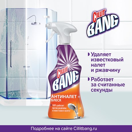 Мощное средство Cillit Bang Антиналет+ Блеск. Bang и грязи как не бывало! Попробуйте по-настоящему мощное средство Cillit Bang Антиналет+ Блеск! Оно эффективно удаляет известковый налет, мыльные разводы, ржавчину и въевшуюся грязь! Чистые поверхности блестят как новые! Идеально подходит для уборки ежедневных или стойких загрязнений, для различных материалов (в том числе керамика, акрил) и поверхностей, таких как ванная, душевая кабина, кафельная плитка, подоконники и др.
