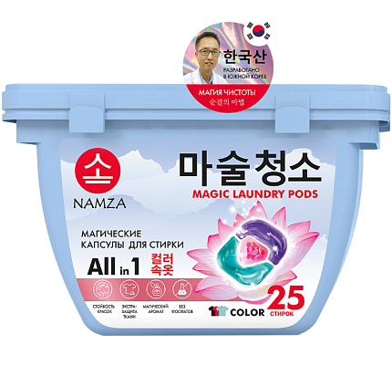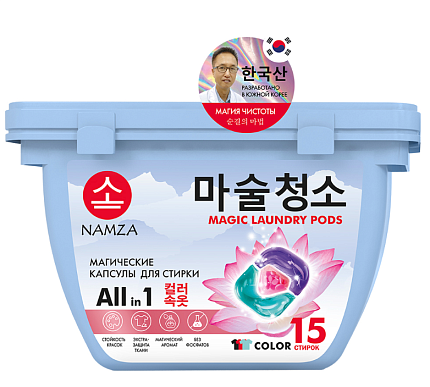 Капсулы для стирки NAMZA All in 1 COLOR, это жидкое средство в новом формате. Подходят для стирки цветного белья из х/б, льняных, синтетических, смешанных и деликатных тканей. Трехкамерные капсулы включают в себя функции сразу трех средств: гель для стирки, пятновыводитель, кондиционер. Благодаря новейшей PMC-технологии, капсулы взрываются при контакте с водой и действующие вещества сразу же проникают в волокна. Капсулы для стиральной машины справляются с любыми типами загрязнений, при этом не разрушают структуру волокон, сохраняют яркость и насыщенность цвета. ПРЕИМУЩЕСТВА NAMZA All in 1 COLOR: 1. Без фосфатов. 2. Магический аромат - парфюмерная композиция PREMIUM-класса. 3. Капсулы полностью растворяются в воде при температуре от 20 °С. 4. Четко выверенная простая дозировка. 1 капсула = 2-5 кг белья, 2 капсулы = 5-9 кг белья Храните капсулы в недоступном для детей и домашних животных месте! Капсулы для стирки, NAMZA разработаны совместно с ведущим технологом Джин-Хо Ким лаборатории Fine Chemical Technolo