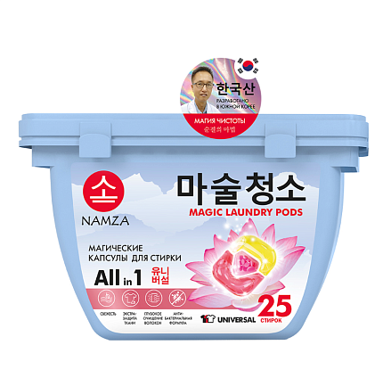 Капсулы для стирки NAMZA All in 1 UNIVERSAL, это жидкое средство в новом формате. Подходят для цветного и белого белья из х/б, льняных, синтетических, смешанных и деликатных тканей. В состав трехкамерной капсулы входит: гель для стирки, пятновыводитель и кондиционирующие гранулы. Благодаря новейшей PMC-технологии, капсулы взрываются при контакте с водой и действующие вещества сразу же проникают в волокна. Жидкое средство для стирки бережно отстирывает любые пятна, при этом не разрушает структуру волокон и придает свежесть. Антибактериальная формула удаляет до 99% всех известных бактерий. ПРЕИМУЩЕСТВА NAMZA All in 1 UNIVERSAL: 1. Глубокое очищение волокон. 2. Магический аромат - парфюмерная композиция PREMIUM-класса. 3. Капсулы полностью растворяются в воде при температуре от 20 °С. 4. Четко выверенная простая дозировка. 1 капсула = 2-5 кг белья, 2 капсулы = 5-9 кг белья Храните капсулы в недоступном для детей и домашних животных месте! Капсулы для стирки NAMZA разработаны совместно с ведущим технологом Дж