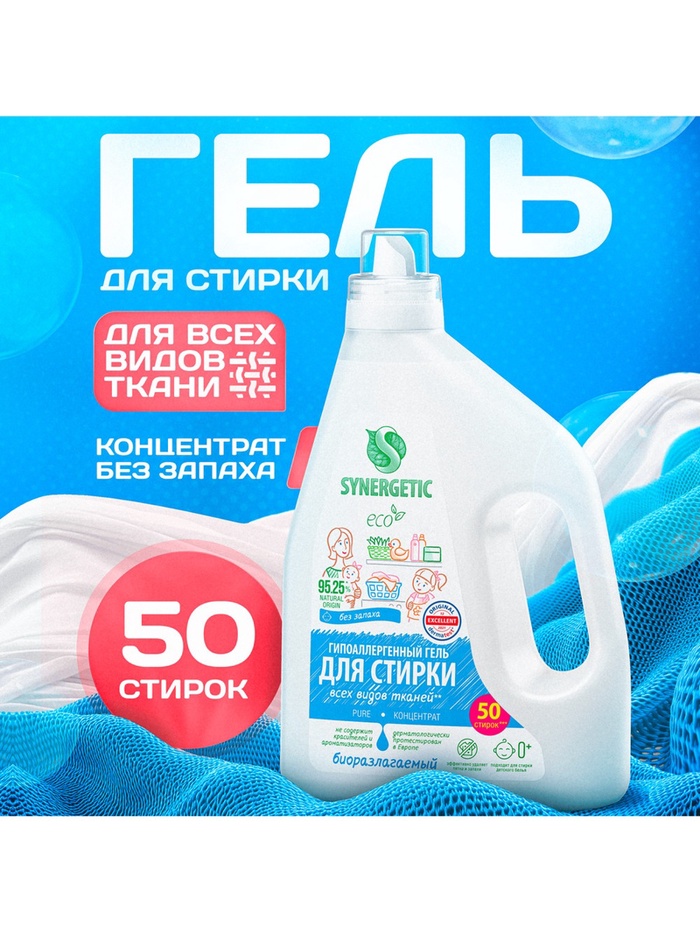 Биоразлагаемый концентрированный гель для стирки всех видов тканей SYNERGETIC PURE обеспечивает бережное и эффективное очищение тканей, гигиеническую чистоту одежды и устраняет неприятные запахи. Средство можно использовать в стиральных машинах любого типа и при ручной стирке при температуре 15 - 90 °C.
