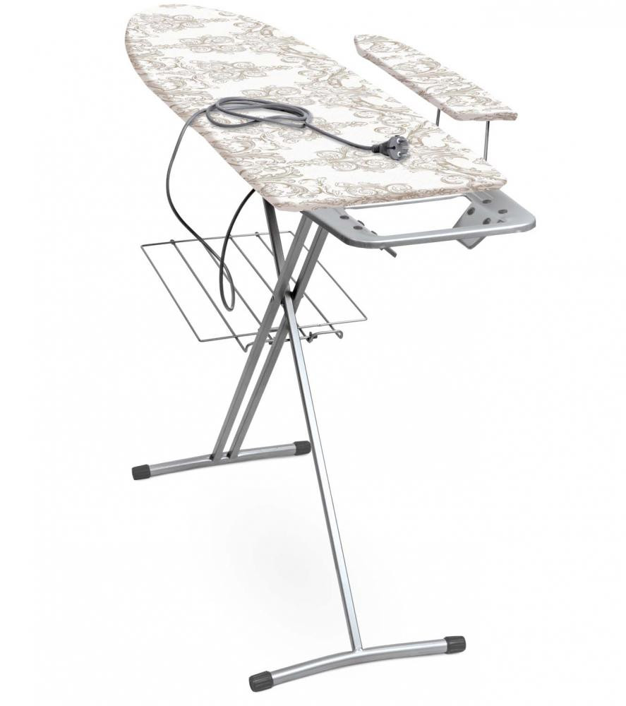 В ассортименте Гладильная доска с EURO подставкой под утюг и съемным подрукавником Преимущества: два положения высоты 70/85см электросоединитель 1,6 м розетка полка для белья максимальная нагрузка на гладильную поверхность 15кг индивидуальная термоупаковка удобное хранение Габаритные размеры: гладильная поверхность (ДхШ) – 1225х345мм в сложенном виде (ДхШхВ) – 1490х345х60мм вес – 6,8кг Материал: гладильная поверхность – фанера чехол – хлопок, цвет в ассортименте
