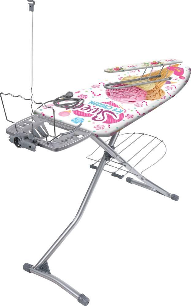 Как на фото Гладильная доска с плавной регулировкой по высоте, EURO подставкой под утюг и съемным подрукавником Преимущества: плавно регулируемая высота до 1м электросоединитель 1,9 м розетка с держателем для провода утюга полка для белья держатель для плечиков максимальная нагрузка на гладильную поверхность 25кг индивидуальная термоупаковка удобное хранение Габаритные размеры: гладильная поверхность (ДхШ) – 1220х400мм в сложенном виде (ДхШхВ) – 1615х425х70мм вес – 7,5кг Материал: гладильная поверхность – металлическая основа чехол – хлопок
