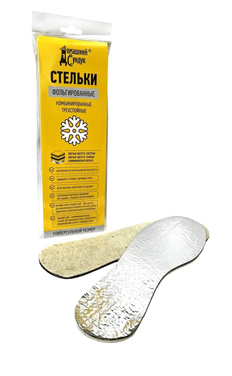 Фольгированные стелькипредназначены для зимней погоды. Включают три слоя из светлой и тёмной овечьей шерсти, а также слой усиленной фольги. Такие стельки позволяют ногам дышать, обеспечивают высокий комфорт при ходьбе. Отлично защищают при сильных морозах. Благодаря слою фольги ноги будут сухими даже при ходьбе по мокрым покрытиям или мокрому снегу. Комфортные, чистые и безопасные.•Можно подогнать под любую стопу.