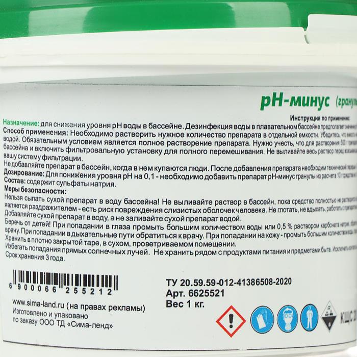 Средство предназначено для снижения уровня рН воды в бассейне. Дезинфекция воды в плавательном бассейне предполагает значение рН 7,0–7,4.