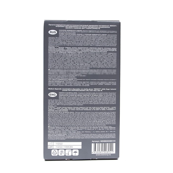 Перчатки Benovy, медицинские, нитриловые, голубые, 3 г, M, 100 пар/уп