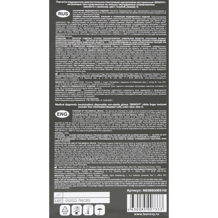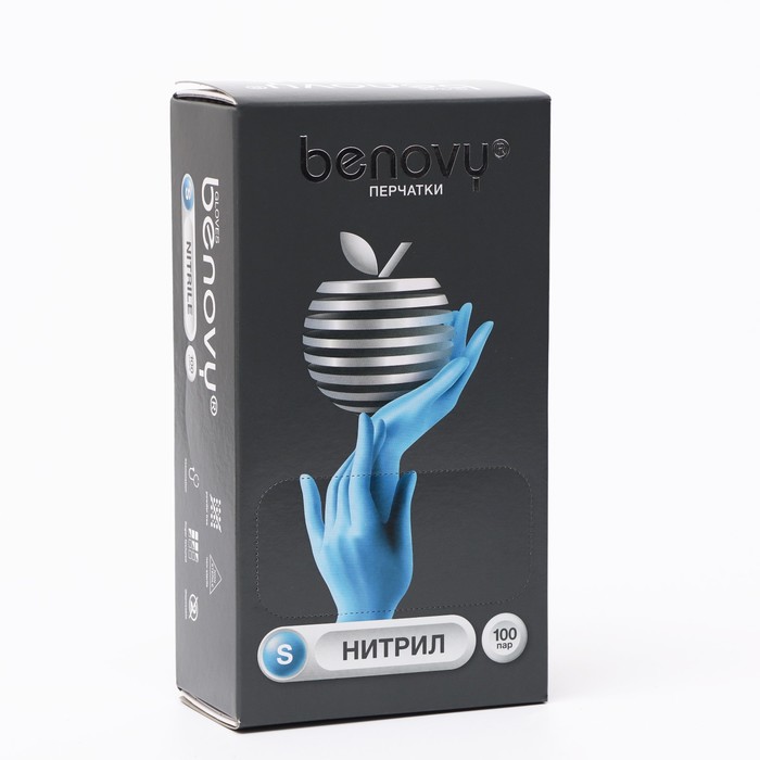 Перчатки Benovy, нитриловые, медицинские, голубые, 3 г, S, 100 пар/уп