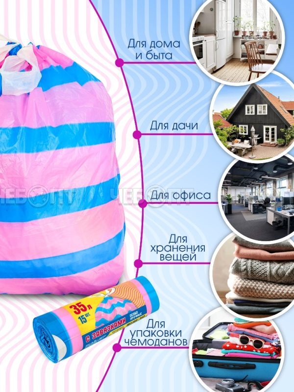 Мешки для мусора 35 л, ПСД с завязками, ПОЛОСАТИКИ ОСОБОПРОЧНЫЕ AVIKOMP, голуб/роз.раз.500*600 мм, толщ.20 мкм, в рол.15 мешк. арт. 40196 [20] АВИКОМП