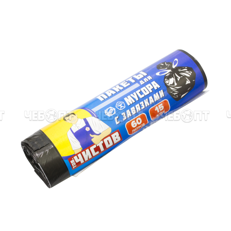 Торгово-производственная компания ЧЕБОПТ продает Мешки для мусора 60 л, ПНД с завязками, ТОВ. ЧИСТОВ размер 600*700 мм, толщина 13 мкм РУЛОН, в ролике 15 мешков арт. 0087, 89208 [20]. Информация по приобретению товара -