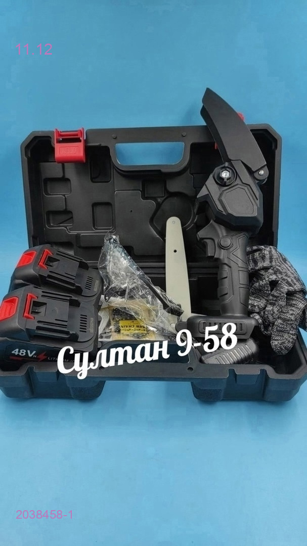 Цвет: цвет 1Портати..показатьвная электрическая цепная мини пила в кейсе (2 аккумулятора)  пила Мини пила ручная электрическая с широким спектром использования: садовая и бытовая – для подрезки и спила садовых деревьев, распила бревен, обрезки сучьев (сучкорез) в саду, на дачном участке, придомовой территории; в ремонтно-строительных работах и работы с деревом как ножовка, пила. Пила работает без привязки к источнику питания 220V (работает от литиевого аккумулятора) Аккумуляторная цепная пила весит до 1-го килограмма и из-за своих небольших габаритов ей очень удобно пользоваться. -Электропила имеет противоскользящую ручку, которая удобно лежит в руке. -Пила ручная является самой безопасной: имеет круглый дизайн, защитное инструментальное покрытие и режущий элемент из современных искусственных материалов. -Благодаря, подвижному защитному кожуху, защищает от разлетающихся щепок и опилок. -Предотвращает случайный запуск пилы, благодаря установленной защите. В комплект входит: пила, 2 АКБ, кейс, зарядка, перчатки, очкивная электрическая цепная мини пила в кейсе (2 аккумулятора)  пила Мини пила ручная электрическая с широким спектром использования: садовая и бытовая – для подрезки и спила садовых деревьев, распила бревен, обрезки сучьев (сучкорез) в саду, на дачном участке, придомовой территории; в ремонтно-строительных работах и работы с деревом как ножовка, пила. Пила работает без привязки к источнику питания 220V (работает от литиевого аккумулятора) Аккумуляторная цепная пила весит до 1-го килограмма и из-за своих небольших габаритов ей очень удобно пользоваться. -Электропила имеет противоскользящую ручку, которая удобно лежит в руке. -Пила ручная является самой безопасной: имеет круглый дизайн, защитное инструментальное покрытие и режущий элемент из современных искусственных материалов. -Благодаря, подвижному защитному кожуху, защищает от разлетающихся щепок и опилок. -Предотвращает случайный запуск пилы, благодаря установленной защите. В комплект входит: пила, 2 АКБ, кейс, зарядка, перчатки, очки