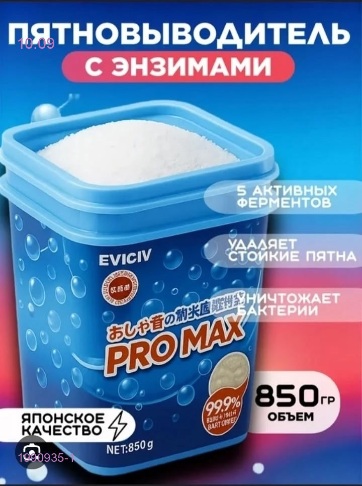Цвет: Цвет 1Вес 850..показатьгр Название продукта: EVICIV PROMAX Нано-гранулы для стирки с активным кислородом и биоактивными ферментами.Особенности: Содержит биоактивные ферменты и нано-гранулы для эффективной очистки, а также технологию EVICIV.Преимущества: Обеспечивает 99.9% бактериостатический эффект, подходит для детской одежды и сохранения цвета, а также для деликатной стирки.Применение: Подходит для различных видов одежды и обеспечивает глубокую очистку с помощью протеазы.гр