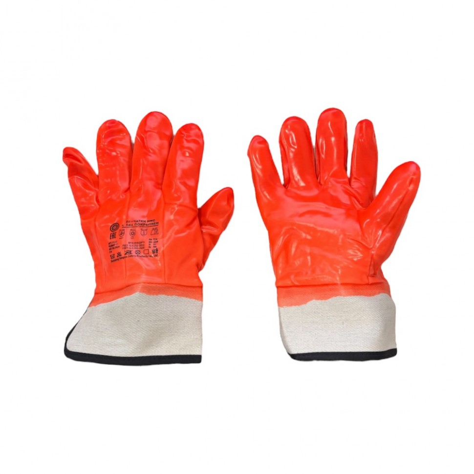 ПВХ – бензо-, маслостойкий материал, который способен оставаться мягким и эластичным и сохранять свои свойства даже при температуре –40 °С. Внутренняя поверхность ладони – шероховатая для лучшего захвата детали при работе. Основа перчаток – флисовая ткань из 100% хлопчатобумажной ткани. Флис позволяет сохранять руки в тепле даже при температуре окружающего воздуха –25 °С. Манжет выполнен из трикотажной ткани «резинка». Она обеспечивает хорошее прилегание манжета к руке. Перчатки являются герметичными перчатками, которые способны предохранить