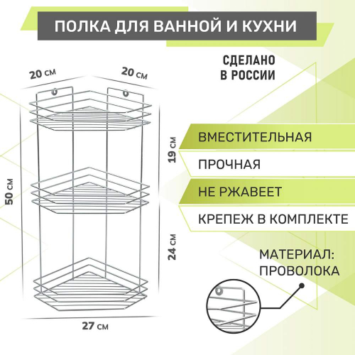 Полка 3-х ярусная угловая 200*270*500мм, хром (440438) изготовлена из качественной стали, устойчивой к высокой влажности.