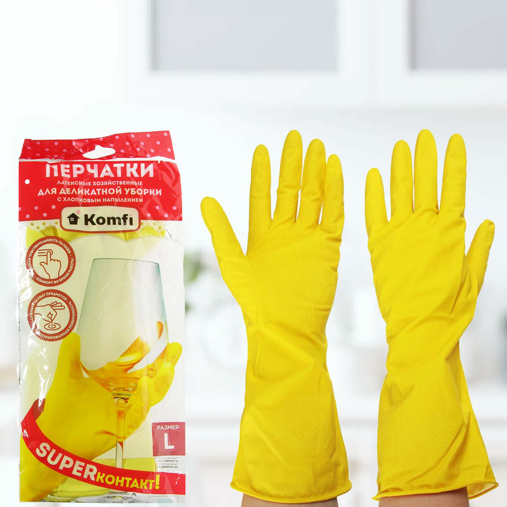 Отзывы и вопросы о товаре «Перчатки латексные Для деликатной уборки с х/б напылением XL (желтые) Komfi»
