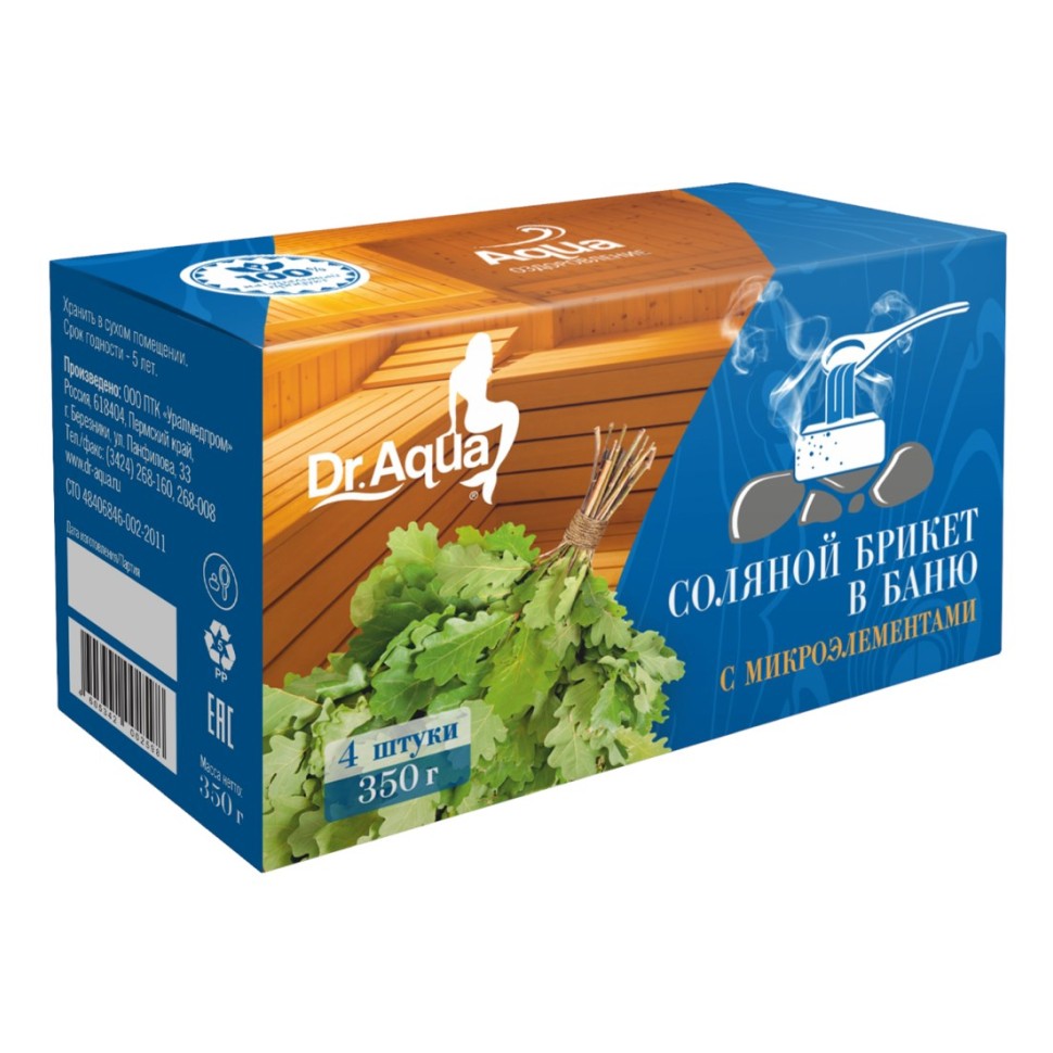 Брикеты «Соль в баню» Dr.Aqua изготовлены из морской природной соли, состав которой — это полезный комплекс макро- и микроэлементов.