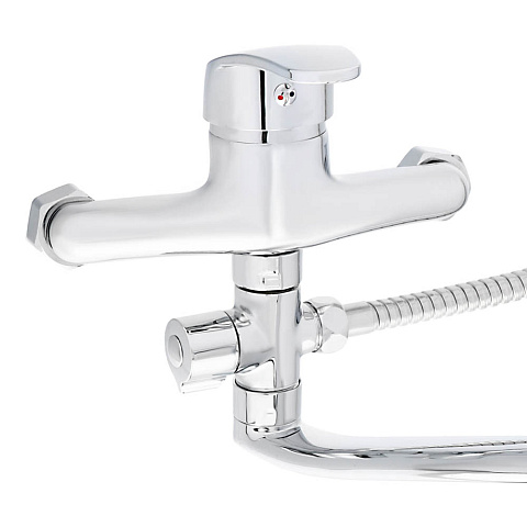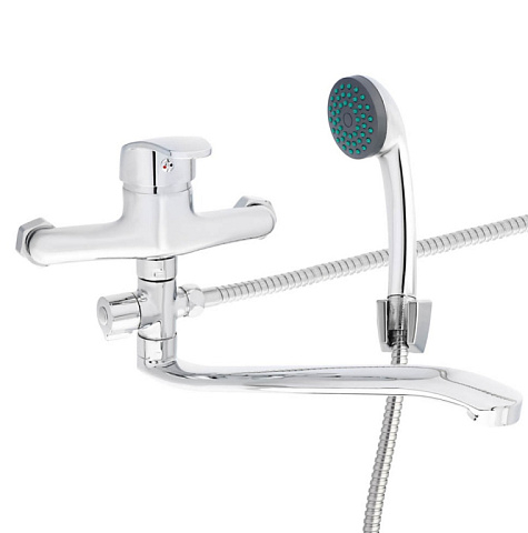 Смеситель для ванны (566-169) оснащен длинным изливом и комплектом для душа, обеспечивающим комфортные водные процедуры.