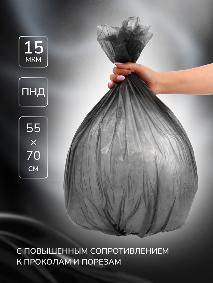 * Прочность и надежность: Мы изготавливаем наши мешки из высококачественного полиэтилена низкого давления (ПНД), обеспечивая повышенную стойкость к проколам и продольным порезам. Мешки выдерживают тяжелые нагрузки и не разорвутся даже при перевозке строительного мусора или других тяжелых отходов.