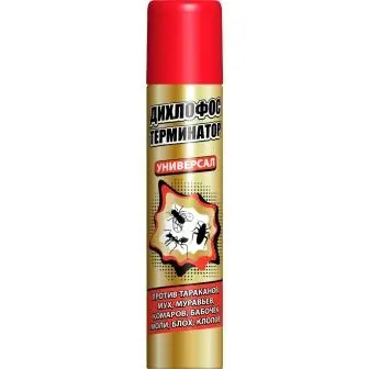 Дихлофос Терминатор Универсал – высокоэффективное инсектицидное средство в форме аэрозоли для уничтожения ползающих и летающих насекомых – тараканов, блох, клопов, муравьев, кожеедов, мух, комаров, москитов, бабочек моли, ос. Применяется в помещениях различного назначения в отсутствие людей специалистами организаций, занимающихся дезинфекционной деятельностью, и населением в быту. В составе препарата имеются вещества, вызывающие мгновенную гибель насекомого.