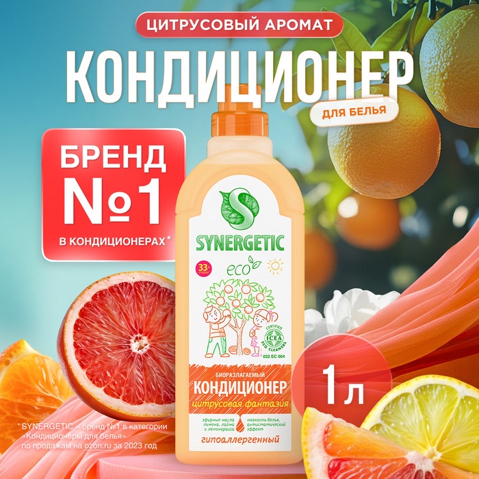 Биоразлагаемый кондиционер-ополаскиватель для белья SYNERGETIC ""Цитрусовая фантазия"" – высокоэффективное средство, бережно ухаживающее за всеми типами ткани, в том числе деликатными, и придающее особую мягкость и нежность белью после стирки.