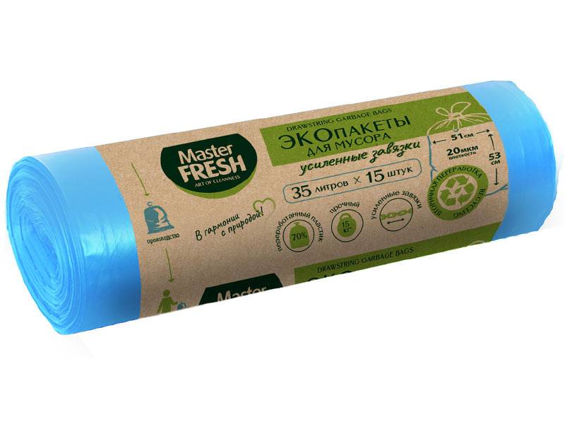 Мешки для мусора 35л 15шт 20мкм ЭКО 70% RECYCLING с усиленными завязками (голубые) Master FRESH