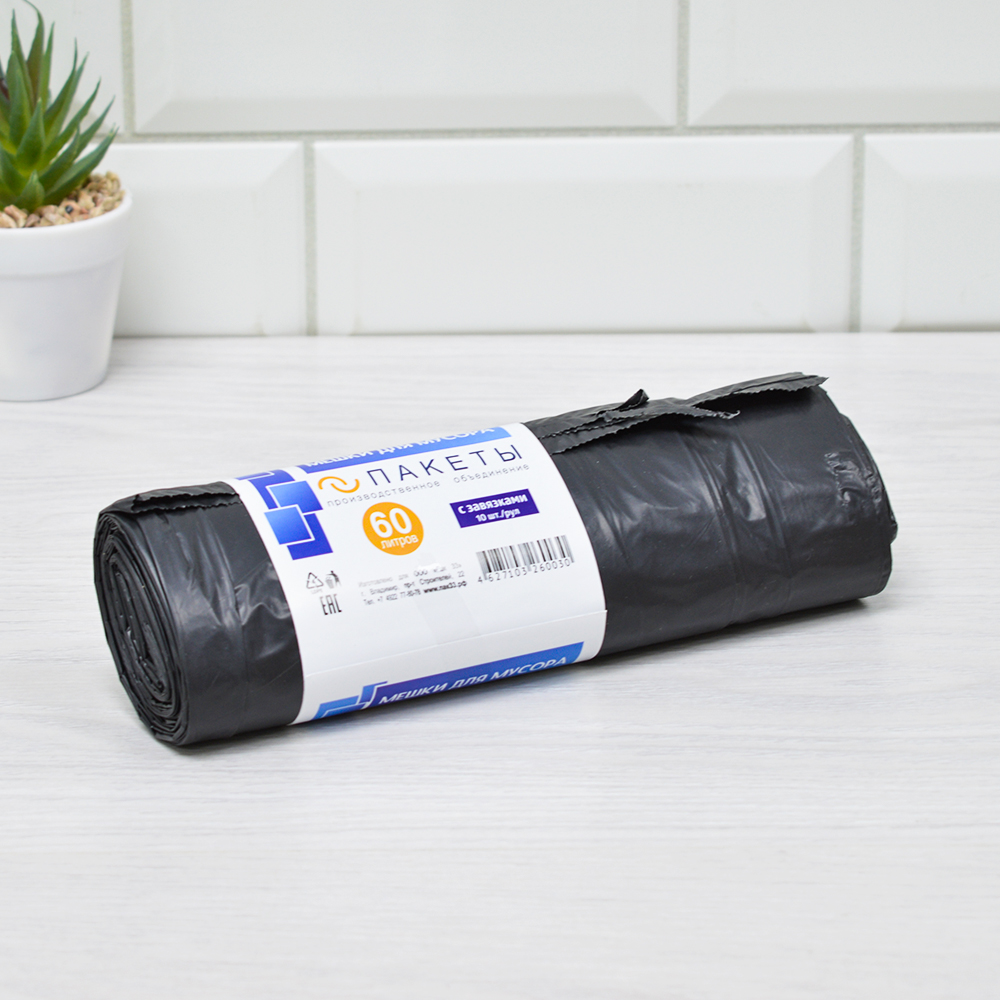 Мешки для мусора 60л 10шт 35мкм ПВД "Завязка" черные