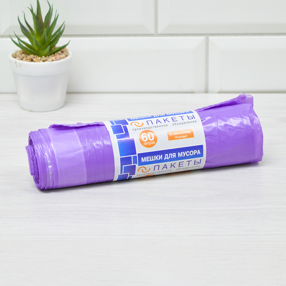 Мешки для мусора 60л 10шт 35мкм ПВД "Завязка" сиреневые