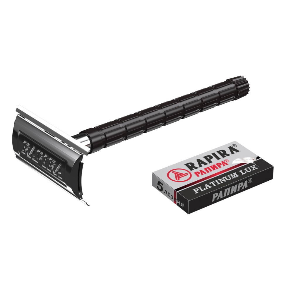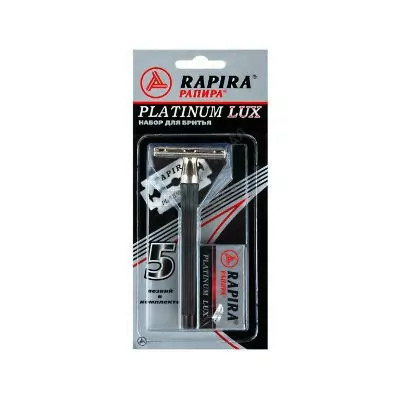 Набор для бритья, станок многоразовый бритвенный классический Т-образный, плюс упаковка двухсторнних классических лезвий Rapira Platinum Lux, в упаковке 5 штук лезвий. Упаковка — блистер с подложкой.