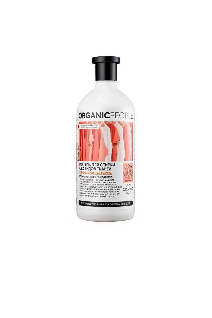 ЭКО-гель создан для эффективной стирки всех видов тканей. Средство прошло органическую сертификацию ECO BIO международного института ICEA. Содержит 99,5% натуральных компонентов. L-AMINO ACID TENSIDE- японский ультрамягкий ПАВ на основе растительных аминокислот, которые являются безопасной моющей основой. Органический экстракт папайи содержит энзимы, которые проникают глубоко в волокна и справляются с удалением разных типов загрязнений, сохраняя цвет и мягкость ткани. Органический экстракт манго - источник органических кислот, которые эффективно удаляют различные виды загрязнений и придают белью необыкновенный аромат. БЕЗОПАСНОСТЬ- Не содержит опасных химических веществ- фосфатов, фталатов, хлора, фенолов, парабенов, EDTA и NTA, флуоресцентных веществ и оптических отбеливателей- Полностью выполаскивается из волокон ткани- Содержит антибактериальный компонент - полностью биоразлагаемый состав- Не содержит компонентов животного происхождения
