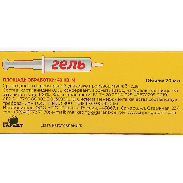 Для получения наилучшего результата обработки рекомендуется не смывать и не удалять гель. Не рекомендуется наносить гель на нагревательные поверхности и пользоваться в обработанных помещениях средствами с резким запахом (лаки, краски, инсектицидные аэрозоли). В случае повторного появления тараканов обработку следует повторить.