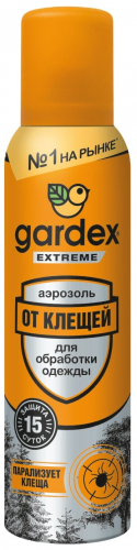 Аэрозоль от клещей Gardex "Extreme" является эффективным средством, парализующим клещей после соприкосновения с одеждой. Также обеспечивает защиту от блох. Действие активного вещества сохраняется до 15 дней.