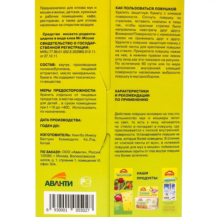 Экологически чистый продукт. Не содержит отравляющих веществ, без запаха. Не оставляет следов после удаления со стекла и других поверхностей. Эффективность ловушки — до 6 месяцев.