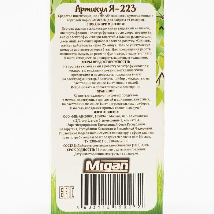 Способ применения: достать флакон с жидкостью и электрофумигатор. Снять защитный колпачок с флакона, ввернуть в электрофумигатор до упора. Повернуть вилку электрофумигатора так, чтобы флакон располагался дном вниз, включить прибор в электро-розетку. Жидкость начинает действовать через 25 минут. Полное уничтожение насекомых достигается через 1 час. Для прекращения работы комплекта - вынуть из розетки фумигатор, отделить от него флакон с жидкостью и накрыть защитным колпачком.