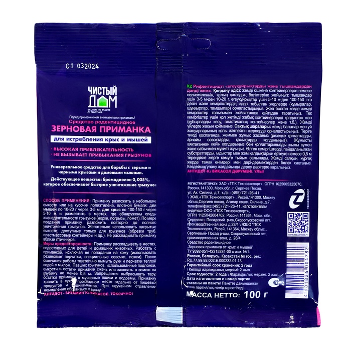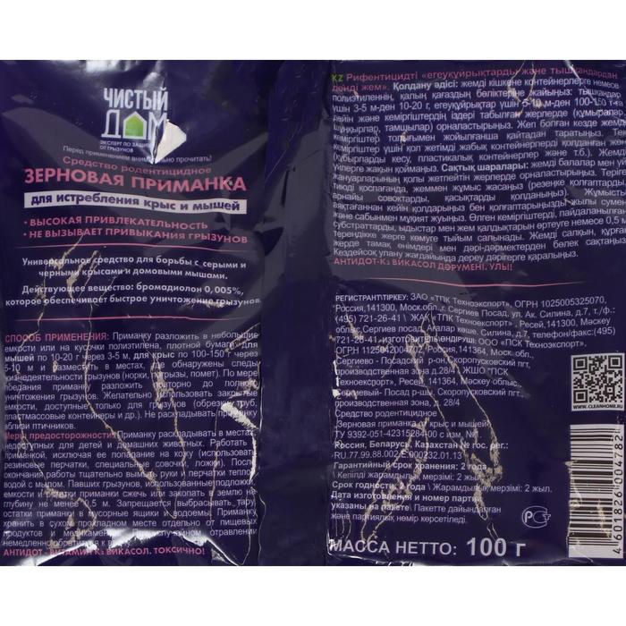 Способ применения: Зерновая приманку «Чистый дом» разложить в небольшие емкости или на кусочки полиэтилена, плотной бумаги: для мышей по 10-20 г через 3-5 м, для крыс по 100-150 г через 5-10 м и разместить в местах, где обнаружены следы жизнедеятельности грызунов (норки, погрызы, помет). По мере поедания приманку разложить повторно до полного уничтожения грызунов. Желательно использовать закрытые емкости, доступные только для грызунов (обрезки труб, пластмассовые контейнеры и др.).