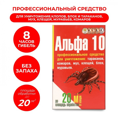 Средство выпускается в форме смачивающегося порошка, который перед применением необходимо развести водой. Обладает быстрым инсектицидным эффектом и остаётся активным на обработанных поверхностях 6–8 недель. Образуемая при нанесении плёнка раствора устойчива к внешним факторам и действует на насекомых при повторном появлении.Средство «Альфа 10» не оставляет следов и запаха. Содержимое упаковки рассчитано на приготовление 1 литра рабочего раствора для обработки помещений до 20 м².Действующее вещество: альфациперметрин (10 %).Назначение: для уничтожения тараканов, муравьёв, клопов, блох, мух, комаров, иксодовых клещей.Способ применения: для приготовления рабочего раствора средство разводят в воде комнатной температуры, равномерно помешивая