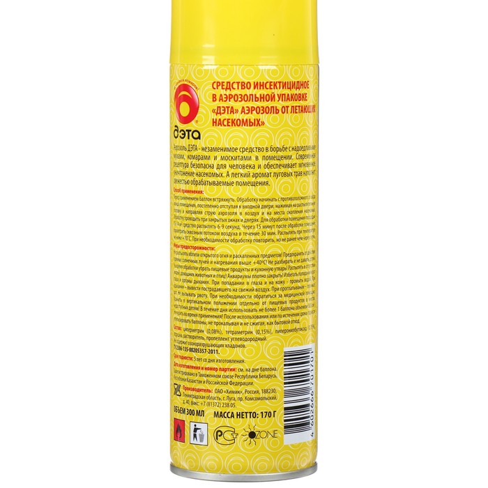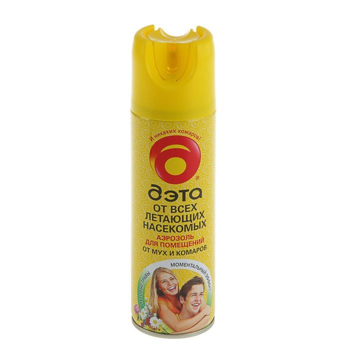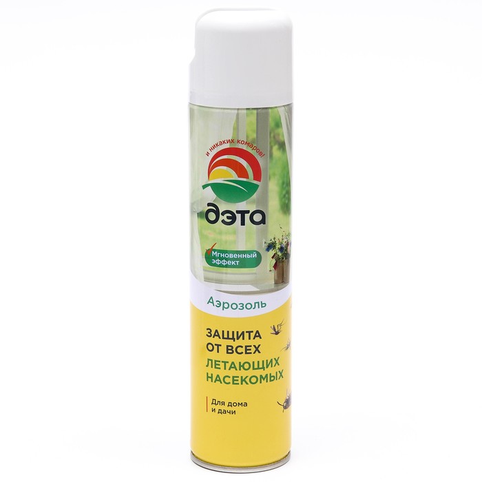 Аэрозоль «Дэта» — это средство от всех летающих насекомых для применения на открытом воздухе. Уничтожает при контакте (вещество с шокирующим эффектом, которое воздействует непосредственно на паразитов). Средство подходит для применения весной и летом. Вещество относится к F — легковоспламеняющееся. Объем — 300 мл. Страна производства — Россия.Использование:Выведите из комнаты людей и животных.Распыляйте средство при температуре не ниже +10 °С.Перед применением встряхните баллон.Закройте окна и начинайте обработку с противоположного от входа конца помещения, постепенно отступая ко входной двери.Направляйте струю на места скопления насекомых.Сразу после обработки покиньте помещение на 15 минут.Для обработки помещения площадью 10-14 м² распыляйте средство 6-9 секунд.Через 15 минут после обработки проветрите помещение в течение 30 минут.При необходимости повторите обработку, но не ранее чем через сутки. Действующее вещество – d-аллетрин, краситель, окислитель, консервант, древесная мука.