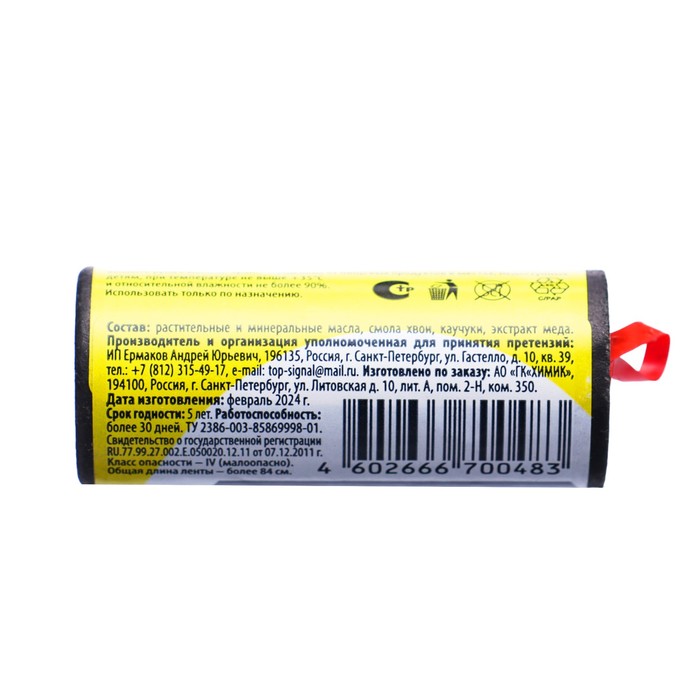 ОписаниеДэта супер липкая лента от мух 1 штПредназначена для борьбы с надоедливыми мухами и другими летающими насекомыми. Без запаха, не токсична. Для дома, дачи и пикника. Рекомендовано использовать 2–3 штуки на каждые 10 м² площади. Средство длительного действия. Замена требуется только по мере заполнения ленты насекомыми. Состав: растительные и минеральные масла, смола хвои, каучуки, экстракт меда