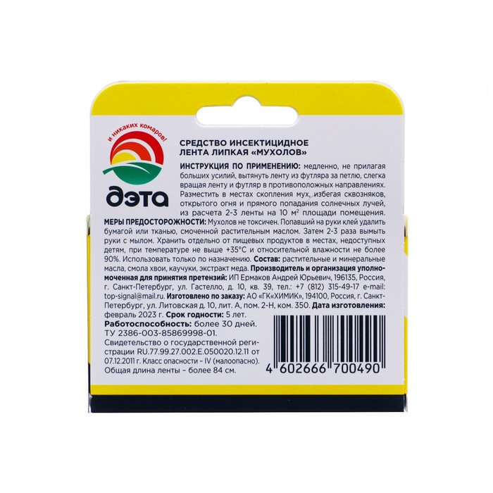 ОписаниеДэта супер липкая лента от мух 4 штПредназначена для борьбы с надоедливыми мухами и другими летающими насекомыми. Без запаха, не токсична. Для дома, дачи и пикника. Рекомендовано использовать 2–3 штуки на каждые 10 м² площади. Средство длительного действия. Замена требуется только по мере заполнения ленты насекомыми. Состав: растительные и минеральные масла, смола хвои, каучуки, экстракт меда