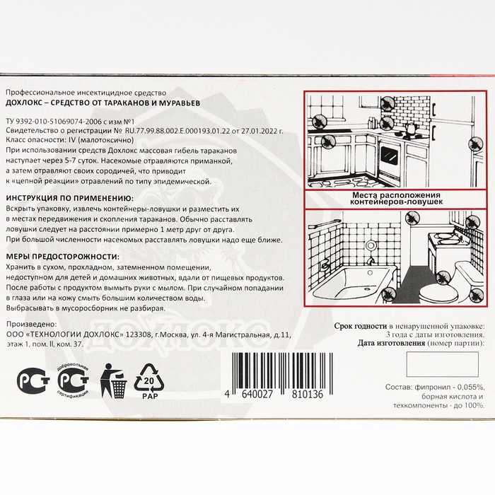 ОписаниеКомплект, состоящий из 4 ловушек и пакета с гелем (40 мл), содержит самую правильную пропорцию геля и ловушек для обработки помещений с не высокой и средней степенью зараженности тараканами. Примерный расход средства в условиях обычной квартиры: Если тараканов мало, они появились недавно 1 упаковки хватит на 40 кв. метров. Если тараканов мало, они появились давно 1 упаковки хватит на 10 кв. метров. Если тараканов много, они появились недавно 1 упаковки хватит на 6 кв. метра. Если тараканов много, они появились давно 1 упаковки хватит на 4 кв. метра.Составдиазинон 0,5% технические компоненты 99,5%Инструкция по применению: размять упаковку, затем вскрыть её ножницами согласно инструкции. Аккуратно нанести гель полосками по периметру помещения: вдоль стен и плинтусов, а также щелей. Особое внимание необходимо уделить вентиляционным отверстиям. Ловушки расставляются в местах скопления тараканов на расстоянии около 1 м друг от друга.