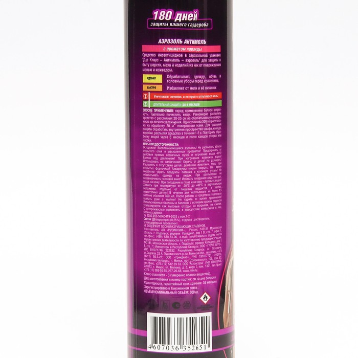 Хранение сезонных вещей без риска. Эффективен против моли, её личинок и кожееда. Уничтожает личинок, а не просто отпугивает моль. Главной фактором порчи мебели и вещей является не взрослая особь, а именно гусеница моли. Мгновенная защита вещей до 6 месяцев. Удобная обработка одежды, обуви, головных уборов. Длительность защиты до 6 месяцев. Dr.Klaus эффективно и безопасно защищает ваши вещи от моли до следующего сезона. Достаточно обработать одежду, обувь и головные уборы перед хранением и проветрить комнату. Для лучшего эффекта рекомендуется также обработать и сами места хранения – шкафы, коробки, ящики. Лёгкое нанесение - Шаг 1: откройте двери и окна, встряхните флакон. Шаг 2: равномерно распылите средство с расстояния 20-25 см до легкого увлажнения. Шаг 3: для лучшего эффекта обработайте места хранения: шкафы, коробки, ящики. Срок годности 3 года.СоставДВ-перметрин – 0,25 %; отдушка – 0,05%; растворитель; углеводородный пропеллент