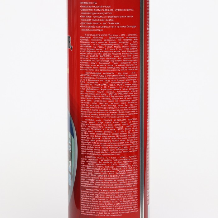 ОписаниеDr.Klaus эффективно и безопасно защищает ваше помещение от ползающих насекомых. Быстро сохнет - удобно для обработки диванов, кроватей и другой мебели. Без запаха. Достаточно обработать плинтусы, щели в стенах и мебели, обратную сторону шкафов, дверные проемы, косяки и др. и затем проветрить комнату. Профессиональная защита от постельных клопов и блох. Продолжительный эффект после использования. Без запаха. Кол-во: 1 шт.Состав:циперметрин - 0,25%, тетраметрин - 0,15% пиперонилбутоксид - 0,80%, растворитель, пропеллент углеводородный.