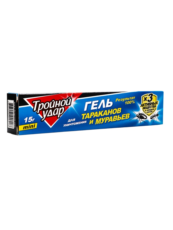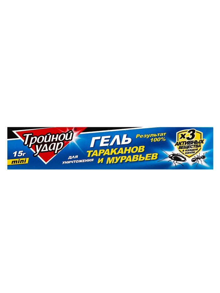 Средство предназначено для уничтожения тараканов и муравьев (рыжих домовых, черных садовых). СОСТАВДействующее вещества - циперметрин 0,1% из группы пиретроидов, имидаклорпид 0,1 представитель неоникотиноидов и фосфоро-органическое соединение диазинон 0,3%. В состав средства также входят: гелеобразователь 1%, вода 10%, битрекс 0,01%, консервант 0,2% и пищевые аттрактанты до 100%.СПОСОБ ПРИМЕНЕНИЯДля уничтожения тараканов перед обработкой проведите уборку помещения, плотно закройте водопроводные краны и ёмкости с водой, лишив насекомых источников влаги. Наносите гель пунктирной линией вдоль плинтусов, в щели и отверстия, в которых могут укрываться тараканы.При малой и средней численности тараканов расход средства: 2 см геля на 4-6 см обрабатываемой поверхности; при большой численности 2 см геля на 2 см поверхности. Гель можно нанести полосками или каплями на небольшие листочки бумаги и разложить их в местах обитания насекомых. Полная гибель тараканов наступает на вторые сутки.Для уничтожения муравьёв нанесите гель пунктиром в местах обнаружения или передвижения насекомых с интервалом в 2-4 см между полосками. Полная гибель наступает на 2‒3 сутки.Повторную обработку следует проводить не ранее, чем через 4 недели. Остаточное действие сохраняется 1,5‒2 месяца.